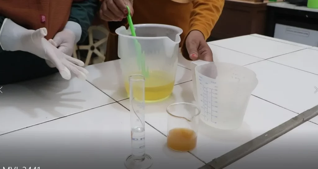 Setelah bahan untuk membuat sabun maupun eco-enzim siap, semuanya dicampur jadi satu. Kemudian dicetak dan ditunggu sampai padat.