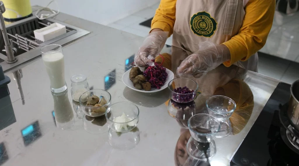 Dosen UMKU, Fariza Yulia Kartika Sari, S.Gz., M.Si., berhasil membuat yoghurt berbahan dasar umbi jangklong dan parijoto. Kedua bahan tersebut merupakan tanaman khas yang banyak ditemui di Kecamatan Dawe hingga Kecamatan Gebog, Kabupaten Kudus.