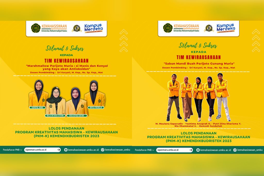 Kudus (19/6/23) Mahasiswa Universitas Muhammadiyah Kudus kembali mengukir prestasi. Dua tim mahasiswa dari Prodi S1 Keperawatan berhasil lolos Program Kreativitas Mahasiswa Kewirausahaan (PKM-K) Kemendikbud Ristek R1 program PKM tahun 2023. Tim pertama beranggotakan M Maulana Saparudin, Yashinta Anugrah H, Putri Dina Kharisma Y, Nia Ilhammatul, dan Hamzah Jundullah mengangkat tema “Sabun Mandi Buah Prijoto Gunung Muria”. Tim kedua beranggotakan Sidrotul Hana, Dilla Oktavia Stifani, Vika Asyila Safani, dan Gayla Fredella mengangkat tema “Marshmallo Parijoto Muria: si Manis dan Kenyal yang Kaya akan Antioksidan”.