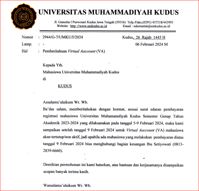 Ba’das salam, memberitahukan dengan hormat, sesuai surat edaran pembayaran registrasi mahasiswa Universitas Muhamamdiyah Kudus Semester Genap Tahun Akademik 2A23-2A24 yang dilaksanakan pada tanggal 5-9 Februari 2024, maka kami sampaikan setelah tanggal 9 Februari 2024 untuk Virtual Aaccount (VA) mahasiswa akan tertutup/non aktif, jadi apabila ada mahasiswa yang melal<ukan pembayaran diatas tanggal 9 Februari 2024 bisa menghubungi bagian keuangan Ibu Setiyowati (0813- 2839-6660).