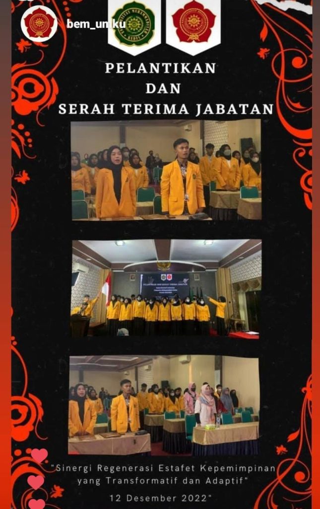 Kudus (12/12/22) Ruang serba guna UMKU menjadi saksi sejarah pergantian kepengurusan BEM Universitas Muhammadiyah Kudus. Abdul Faruq resmi menjadi Presiden Mahasiswa BEM UMKU periode 2022/2023 didampingi Wapresma Tri Agustina Damayanti.