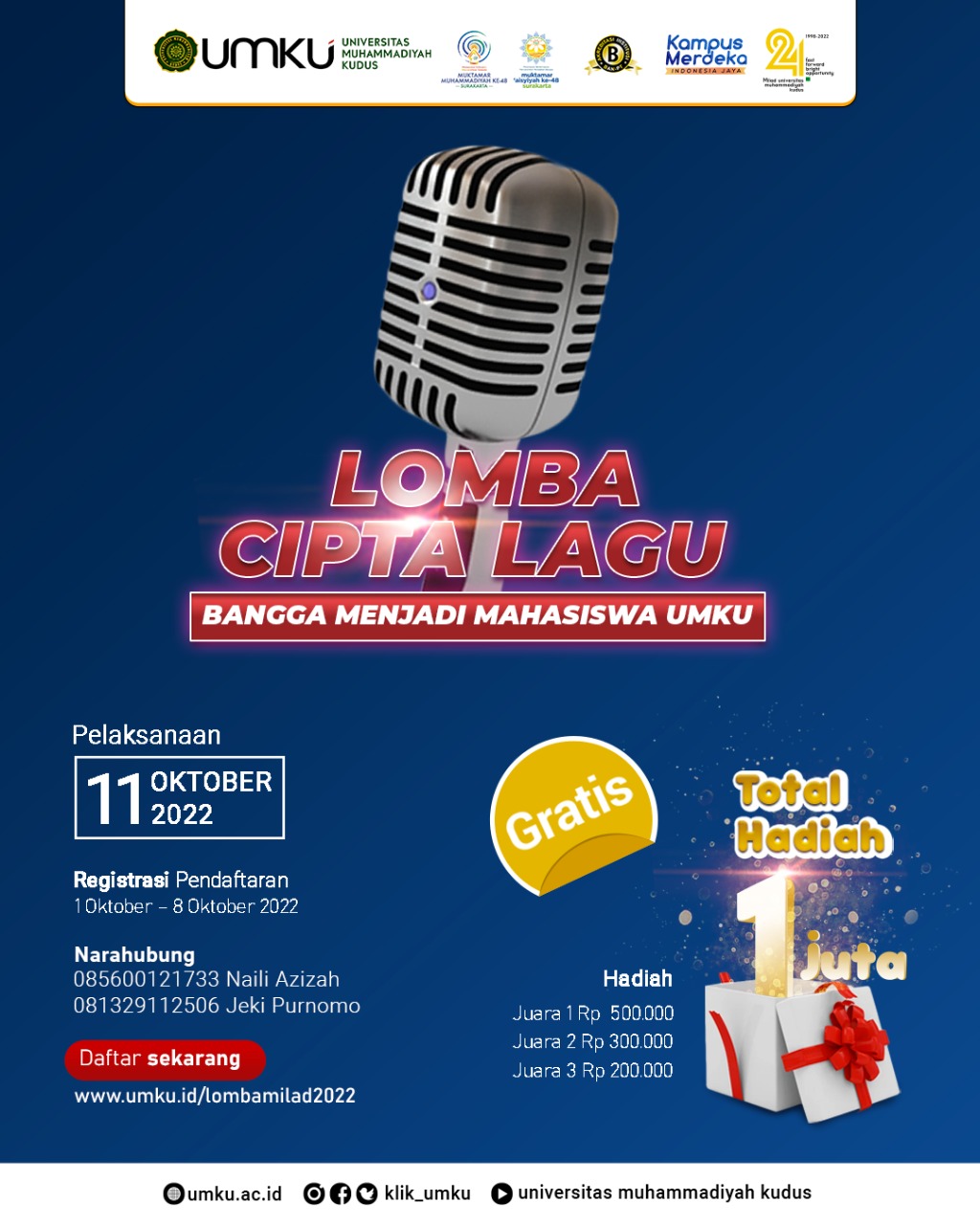 LOMBA CIPTA LAGU BANGGA MENJADI MAHASISWA UMKU dalam rangka Milad Universitas Muhammadiyah Kudus ke-24 sudah dibuka.