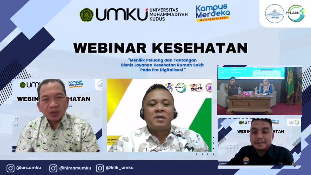 Webinar dengan tema “Peluang dan Tantangan Bisnis Layanan Kesehatan Rumah Sakit di Era Digitalisasi” menghadirkan pembicara expert dibidangnya. Pembicara tersebut ialah dr. Bayu Chandra Cahyono, MM, CPHCM, (Owner Nusantara Hospital Training and Consulting), pembiacara kedua Neni Muslimah Syari, S.AB., M.MRS (RSI Sunan Kudus/dosen Prodi ARS UMKU)